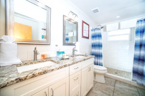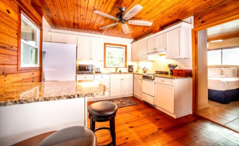 The Blue Heron Cottage is a two bedroom, loft and one bathroom air conditioned stilt cottage with one queen bed in each room, two twins in the loft, basic TV, fully equipped and furnished kitchen and a large screened front porch with a view of the marina.
